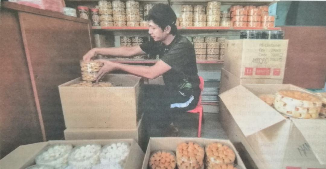 Adi Setiawan memasukkan kuih raya ke dalam kotak untuk diagihkan kepada ejen beliau sebagai persiapan Aidilfitri pada minggu akhir bulan Ramadan di Jalan Raja Mahmud, Kampung Baru, Kuala Lumpur.