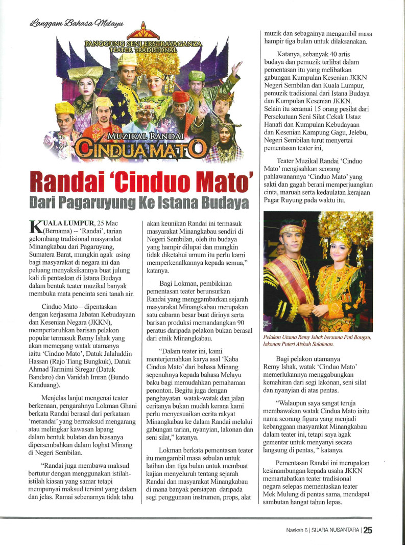 Suara Nusantara, “Randai 'cinduo mato' dari pagaruyung ke istana budaya,” Rimbunan: Pangkalan Data Pengajian Melayu, accessed February 3, 2026, https://rimbunan.nusa.my/rimbun/items/show/859.