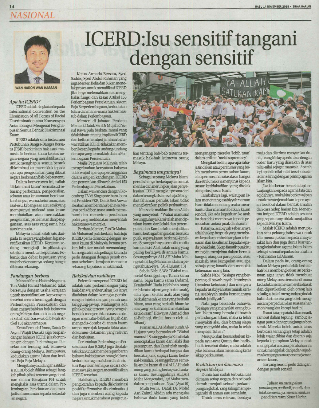 Wan haron Wan Hassan, “ICERD: isu sensitif tangani dengan sensitif,” Rimbunan: Pangkalan Data Pengajian Melayu, accessed February 3, 2026, https://rimbunan.nusa.my/rimbun/items/show/869.